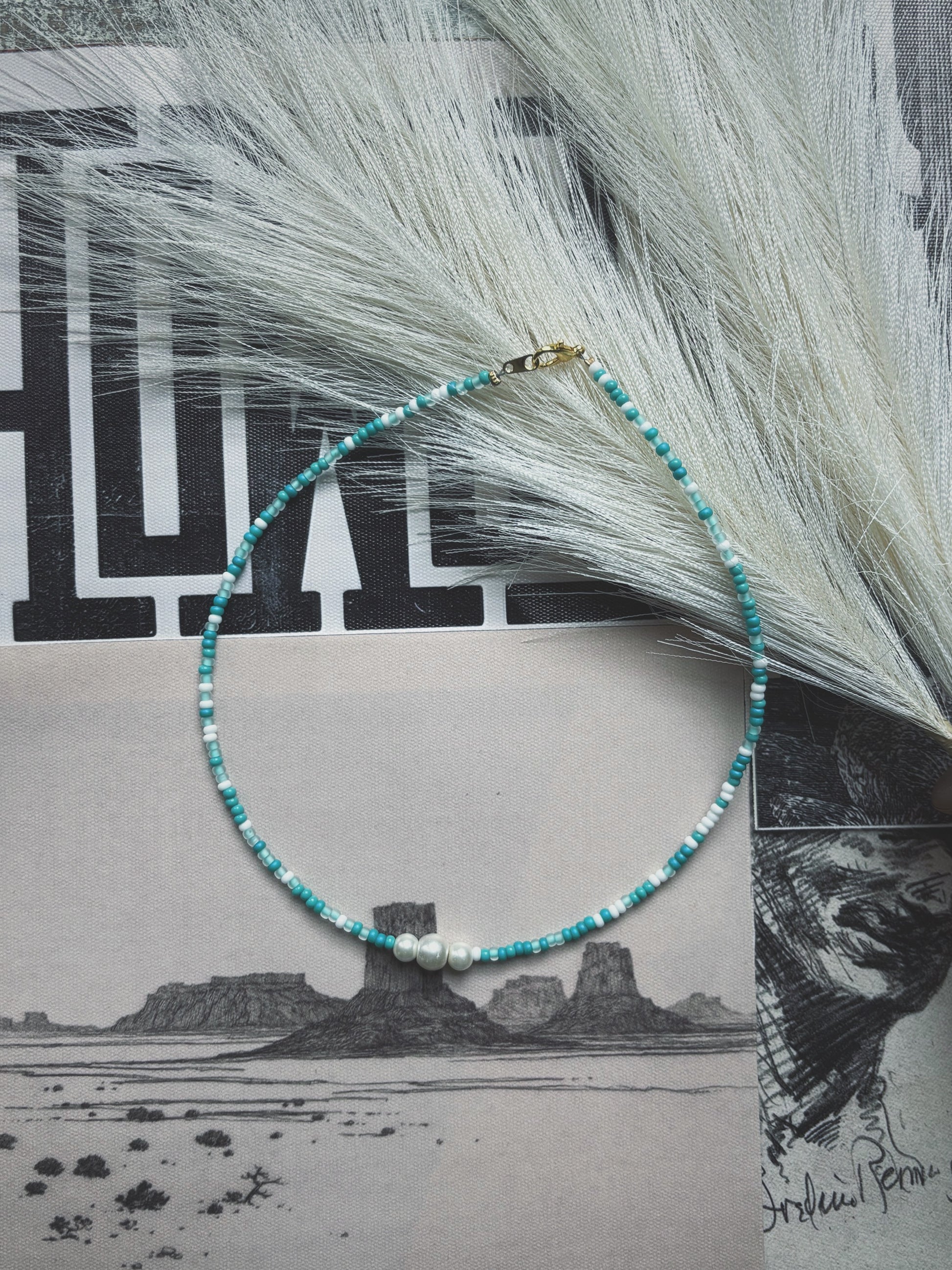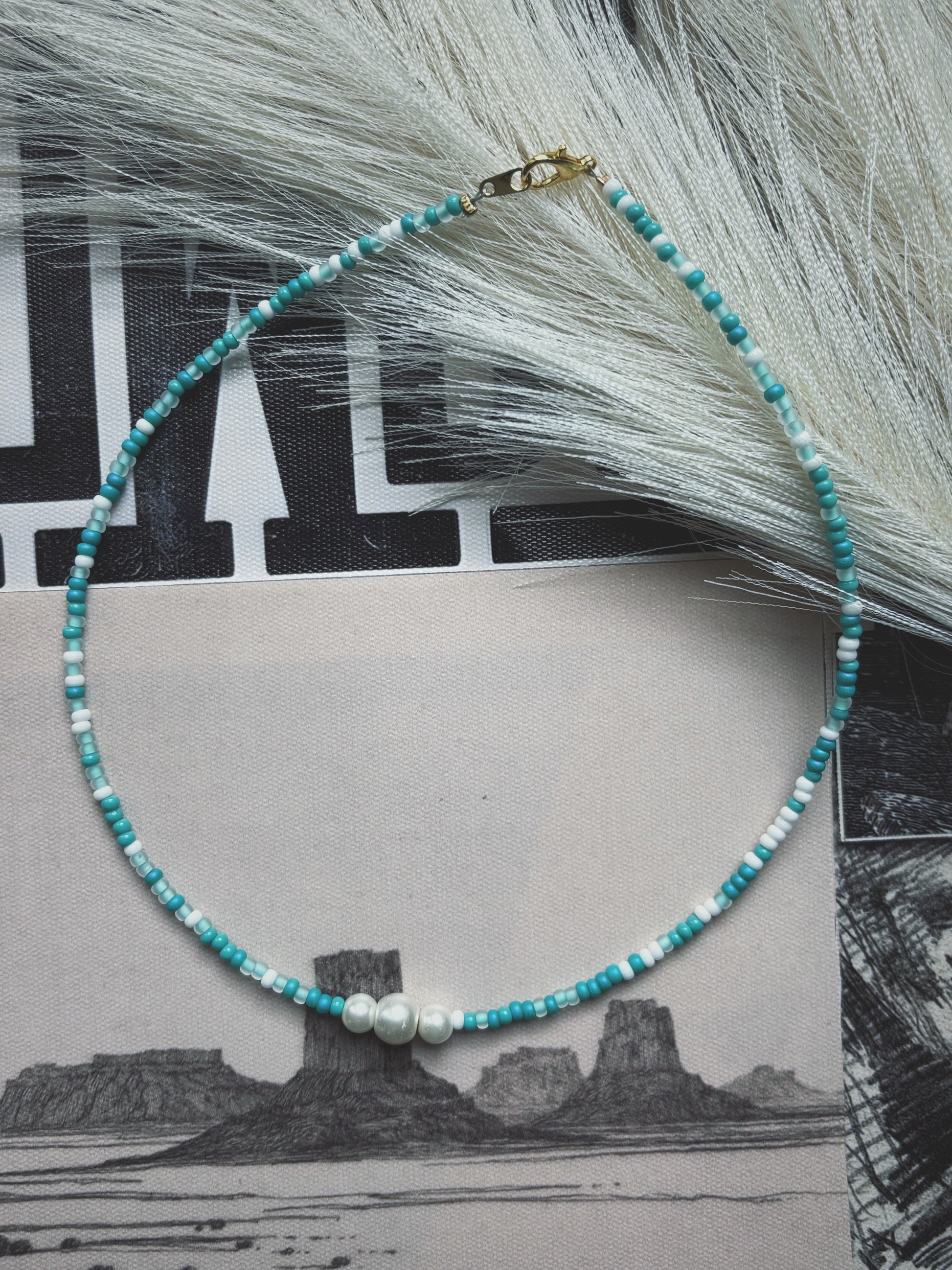 Elevate your wardrobe with the Coastal Cowgirl Ocean Waves necklace. This piece adds a unique coastal vibe to any outfit. Crafted from seed beads and faux pearls, it's a stylish accessory. The 14k gold plated stainless steel ensures durability and elegance. Perfect for those who love a touch of the ocean in their fashion.